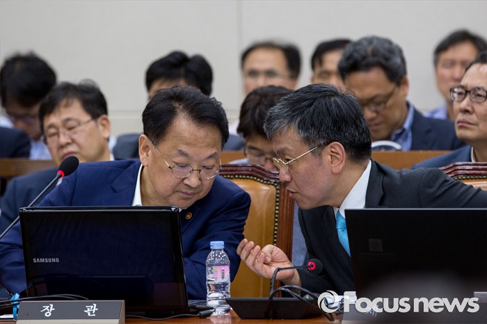 (서울=포커스뉴스) 유일호(왼쪽) 경제부총리 겸 기획재정부 장관과 최상목 기획재정부 1차관이 13일 오후 서울 여의도 국회에서 열린 '기획재정위원회 전체회의'에 참석해 대화 하고 있다. 이날 기재위 여야 의원들은 대우조선해양과 관련된 자료를 보지 않고는 조선업 구조조정에 대한 추경예산 편성이 어렵다는 입장을 밝혔다.