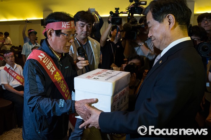 (서울=포커스뉴스) 국방부가 사드 배치 지역을 경북 성주로 확정지은 13일 오후 서울 용산구 국방컨벤션을 찾은 성주군민들이 사드배치 반대 성명서를 황인무 국방부 차관에게 전달하고 있다.