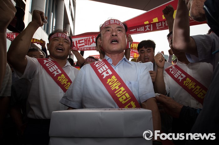 (서울=포커스뉴스) 13일 오후 서울 용산구 국방부를 찾은 성주 군수와 군민들이 사드배치 반대 성명서를 전달하기 위해 국방컨벤션을 들어서고 있다. 이날 국방부에서 주한미군 고고도 미사일 방어 체계 사드(THAAD) 배치 지역을 성주로 결정하고 공식 발표했다.