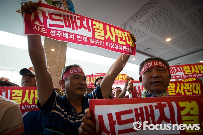 (서울=포커스뉴스) 13일 오후 서울 용산구 국방부를 찾은 성주 군수와 군민들이 사드배치 반대 성명서를 전달하기 위해 국방컨벤션을 들어서고 있다. 이날 국방부에서 주한미군 고고도 미사일 방어 체계 사드(THAAD) 배치 지역을 성주로 결정하고 공식 발표했다.