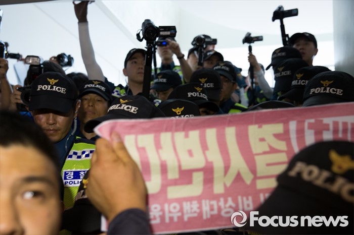 (서울=포커스뉴스) 국방부가 사드 배치 지역을 경북 성주로 확정 지은 13일 오후 서울 용산구 국방컨벤션에서 성주군민들이 군수와 국방부 관계자 면담자리에 진입을 시도하고 있다.