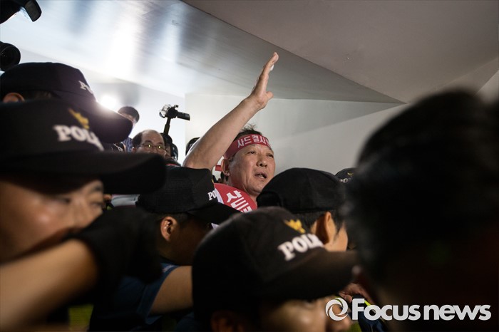 (서울=포커스뉴스) 국방부가 사드 배치 지역을 경북 성주로 확정 지은 13일 오후 서울 용산구 국방컨벤션에서 성주군민들이 군수와 국방부 관계자 면담자리에 진입을 시도하자 김항곤 성주 군수가 군민들을 진정시키고 있다.