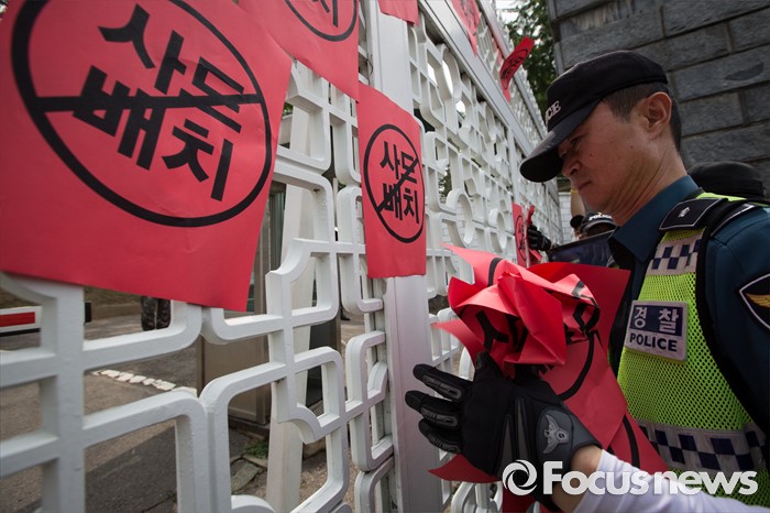 (서울=포커스뉴스) 경찰들이 13일 오후 서울 용산구 국방부 정문 앞에서 평통사(평화와 통일을 여는 사람들) 관계자들과 시민들이 붙여 놓은 사드 배치 반대 스티커를 떼어내고 있다. 이날 국방부는 주한미군 고고도 미사일 방어 체계 사드(THAAD) 배치 지역을 성주로 결정, 발표 했다.
