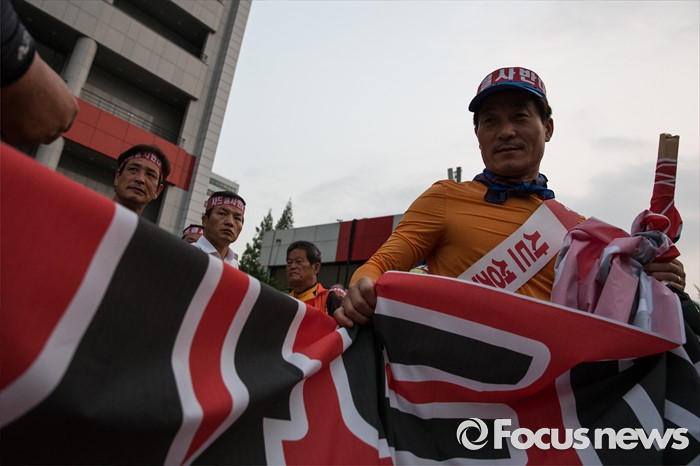 (서울=포커스뉴스) 13일 오후 서울 용산구 국방컨벤션을 찾은 군민들이 사드배치 반대 집회를 하고 현수막을 접고 있다..이날 국방부에서 주한미군 고고도 미사일 방어 체계 사드(THAAD) 배치 지역을 성주로 결정하고 공식 발표했다.