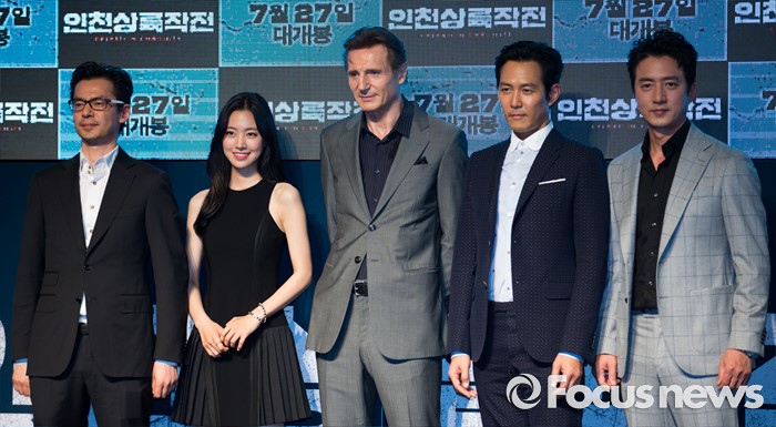 (서울=포커스뉴스) 13일 오후 서울 영등포구 타임스퀘어에서 열린 영화 '인천상륙작전' 레드카펫 행사에 참석한 출연진들이 포즈를 취하고 있다. 왼쪽부터 이재한 감독, 배우 진세연, 리암 리슨, 이정재, 정준호.