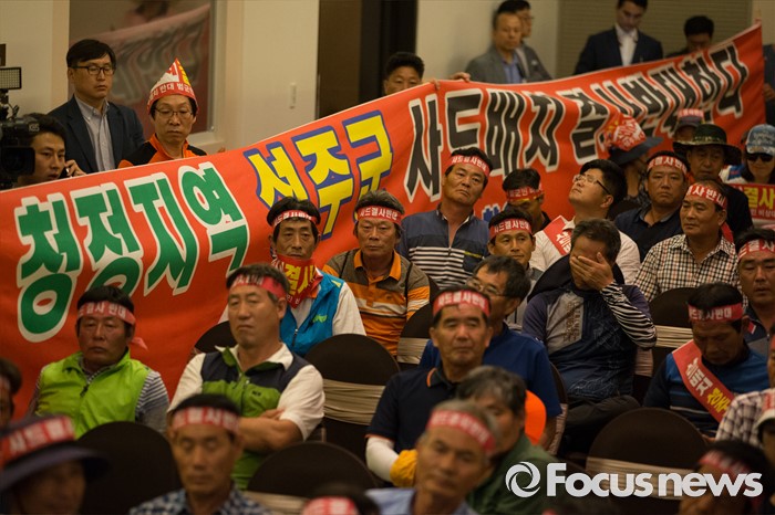 (서울=포커스뉴스) 성주 군민들이 13일 오후 서울 용산구 국방컨벤션센터에서 한민구 국방부 장관의 발언를 듣고 있다. 국방부는 이날 경북 성주군을 고고도 미사일 방어(사드·THAAD)체계 배치 지역이라고 공식 발표했다.