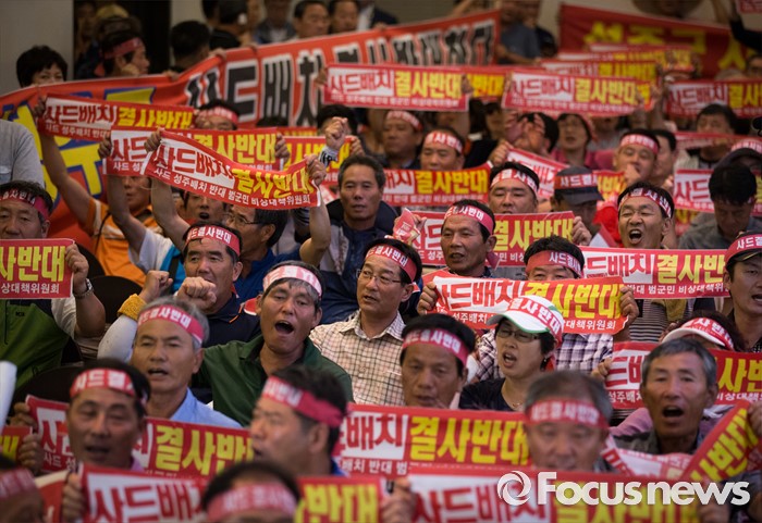 (서울=포커스뉴스) 13일 오후 서울 용산구 국방컨벤션센터에서 사드 배치에 항의 방문 중인 김항곤 성주군수 등 사회단체장 및 군민들이 성주 사드 배치 반대 구호를 외치고 있다. 국방부는 이날 경북 성주군을 고고도 미사일 방어(사드·THAAD)체계 배치 지역이라고 공식 발표했다.