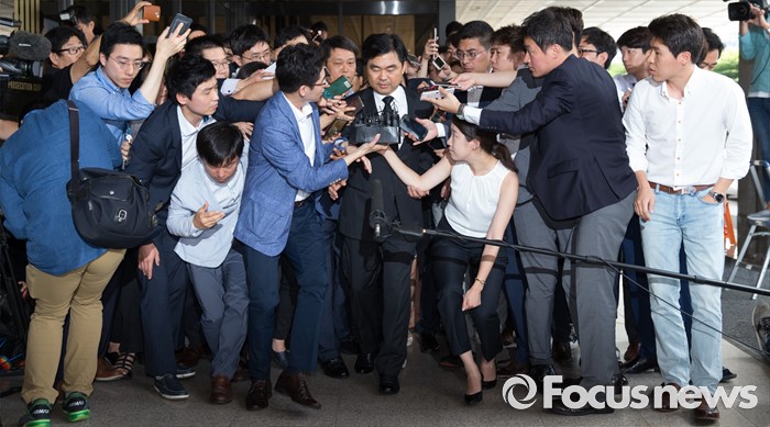 (서울=포커스뉴스) '주식 대박' 논란에 휩싸인 진경준 검사장이 14일 오전 서울 서초구 서울중앙지방검찰청으로 출석하고 있다.