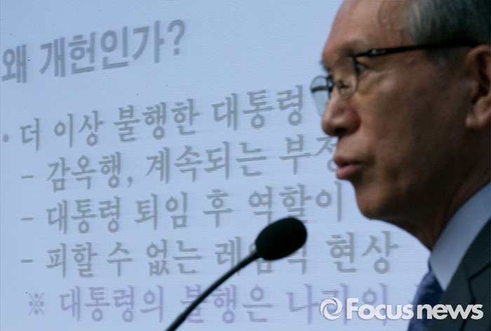(서울=포커스뉴스) 14일 오전 서울 여의도 국회 의원회관에서 한국적 제3의 길(대표의원 박영선) 후원으로 열린 '개헌을 말하다'에 참석한 김형오 전 국회의장이 개헌의 필요와 방향에 대한 강연을 하고 있다.