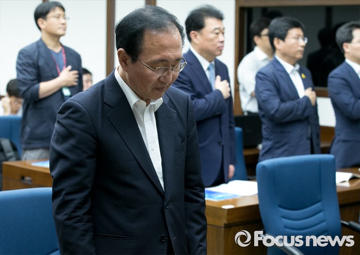 (서울=포커스뉴스) 14일 오전 서울 여의도 국회도서관에서 열린 민주적 여론형성을 위한 법제도 개선사항 정책토론회에 참석한 노회찬 정의당 원내대표가 국기에 대한 경례 중 묵념을 하고 있다.
