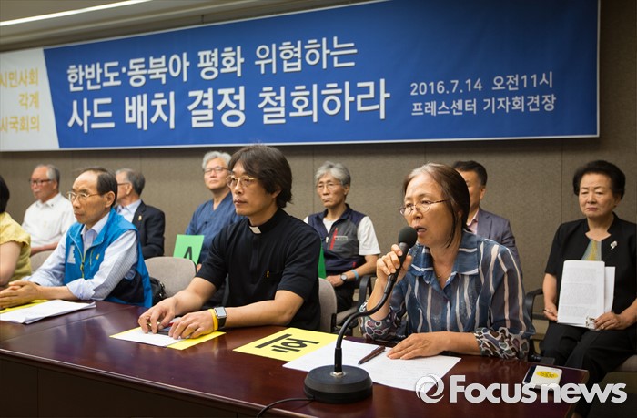 (서울=포커스뉴스) 14일 오전 서울 중구 한국프레스센터에서 시민 사회 각계 인사들이 모여 '한반도, 동북아 평화 위협하는 사드 배치 결정 철회 촉구' 시국회의를 하고 있다.