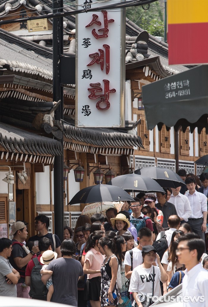 (서울=포커스뉴스) 초복을 사흘 앞둔 14일 오후 서울 종로구에 위치한 한 삼계탕 전문식당을 찾은 시민들이 줄을 서고 있다.