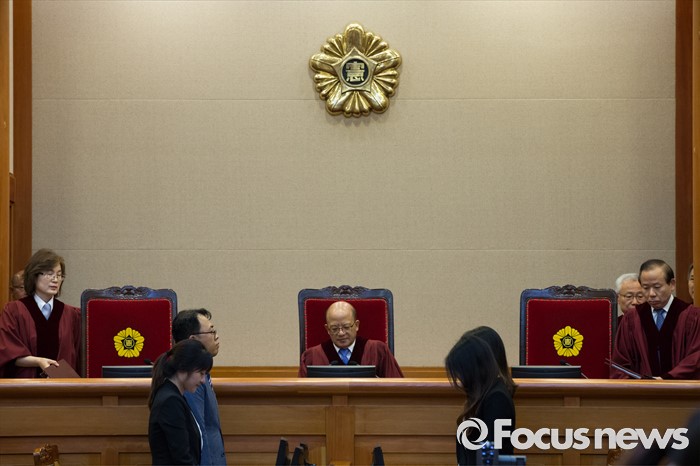 (서울=포커스뉴스) 14일 오후 서울 종로구 헌법재판소 대심판정에서 박한철 헌법재판소장이 비례대표 국회의원 후보 공개연설 금지 공개 변론를 위해 입장해 자리에 착석하고 있다.