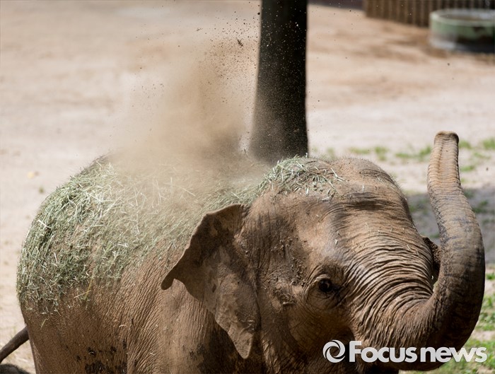 (과천=포커스뉴스) 14일 오후 경기도 과천 서울대공원에서 코끼리 가자바(암컷)가 몸에 흙을 뿌리며 더위를 식히고 있다.