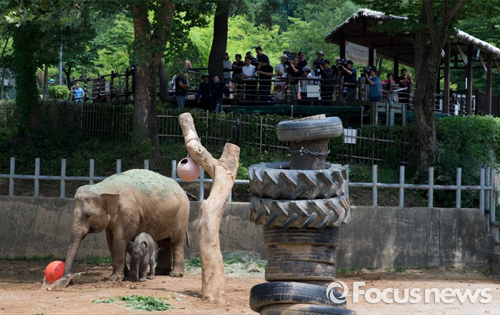(과천=포커스뉴스) 14일 오후 경기도 과천 서울대공원에서 지난달 24일에 태어난 새끼 아시아 코끼리(암컷)가 가자바(어미)와 함께 야외 방사장을 뛰놀고 있다. 이 아기코끼리는 '멸종위기에 처한 야생 동식물의 국제 거래에 관한 협약(CITES)' 1급 보호종으로 지정된 아시아코끼리다.