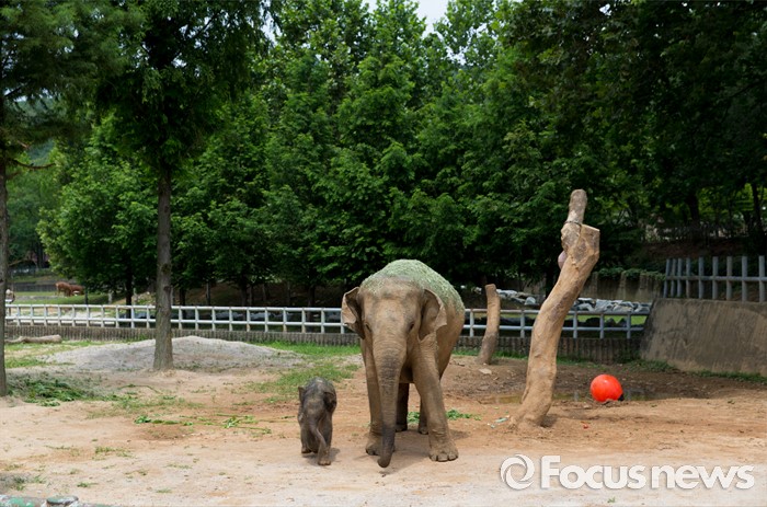 (과천=포커스뉴스) 14일 오후 경기도 과천 서울대공원에서 지난달 24일에 태어난 새끼 아시아 코끼리(암컷)가 가자바(어미)와 함께 야외 방사장을 뛰놀고 있다. 이 아기코끼리는 '멸종위기에 처한 야생 동식물의 국제 거래에 관한 협약(CITES)' 1급 보호종으로 지정된 아시아코끼리다.