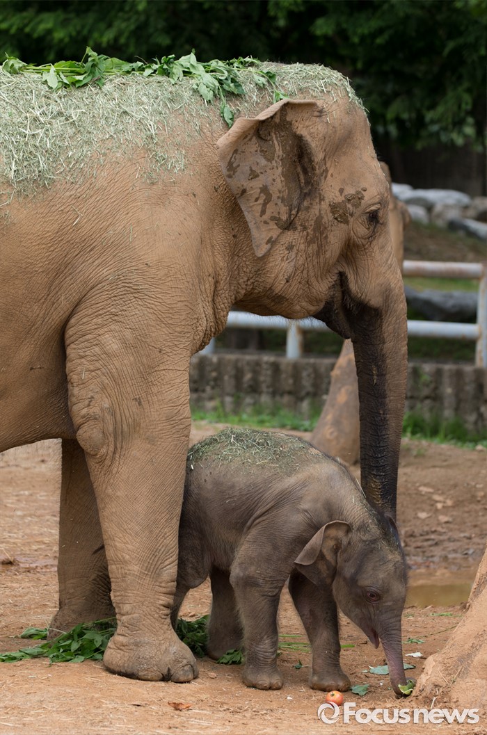 (과천=포커스뉴스) 14일 오후 경기도 과천 서울대공원에서 지난달 24일에 태어난 새끼 아시아 코끼리(암컷)가 가자바(어미)와 함께 야외 방사장을 뛰놀고 있다. 이 아기코끼리는 '멸종위기에 처한 야생 동식물의 국제 거래에 관한 협약(CITES)' 1급 보호종으로 지정된 아시아코끼리다.