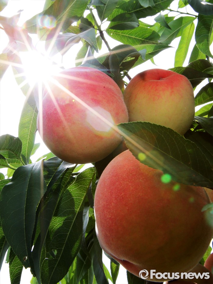 (세종=포커스뉴스) 초복을 사흘 앞둔 14일 세종시 조치원읍 복숭아농장에서 복숭아가 여름 햇빛 아래 탐스럽게 익고 있다.