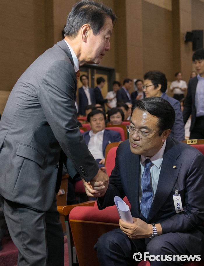(서울=포커스뉴스) 14일 오후 서울 여의도 국회 의원회관에서 열린 새누리당 전국위원회에 참석한 정진석(오른쪽) 원내대표와 전당대회 출마를 선언한 한선교 의원이 인사하고 있다.
