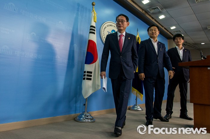 (서울=포커스뉴스) 여야3당 원내수석부대표가14일 오후 서울 여의도 국회에서 여야3당 원내수석부대표 합의사항을 발표한 뒤 기자회견장을 나서고 있다. 이날 여야3당은 사드(고고도미사일방어체계) 국내 배치 결정에 따른 논한과 관련해 다음주 긴급 현안 질의를 위한 국회 본회의를 개최하는데 합의 했다고 밝혔다. 왼쪽부터 김도읍 새누리당 원내수석부대표, 김관영 국민의당 원내수석부대표, 박완주 더불어민주당 원내수석부대표.