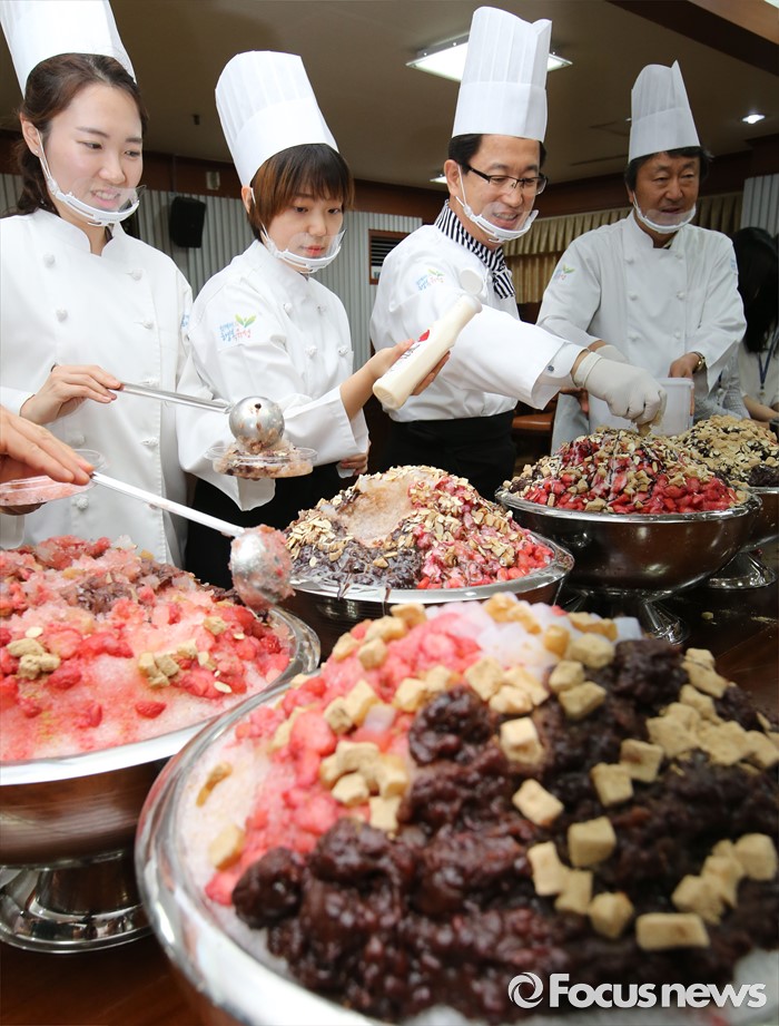 (대전=포커스뉴스) 초복을 사흘 앞둔 14일 오후 대전 유성구청에서 열린 팥빙수데이 행사에서 허태정 구청장과 직원들이 함께 팥빙수를 만들고 있다. 이번 팥빙수데이 행사에는 팥빙수 900인분을 만들어 구 산하 직원들에게 전달했다.