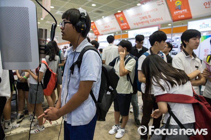 (서울=포커스뉴스) 14일 오후 서울 강남구 코엑스에서 열린 전문대학 엑스포에 참가한 고등학생들이 한 대학 실용음악과가 마련한 미니 녹음실 앞에서 노래를 부르고 있다.