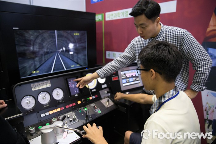 (서울=포커스뉴스) 14일 오후 서울 강남구 코엑스에서 열린 전문대학 엑스포에 참가한 한 고등학생이 한 대학 부스에 마련된 철도 시뮬레이션을 체험하고 있다.