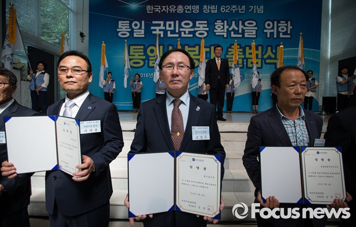 (서울=포커스뉴스) 14일 오후 서울 중구 한국자유총연맹 본부에서 '한국자유총연맹 창립 62주년 기념 통일 선봉대 출범식' 이 열리고 있다. 이날 출범식을 마친 김경재 한국자유총연맹 회장(전 박근혜 대통령 홍보특별보좌관)과 연맹 회원들은 사드 배치를 지지하는 결의 행동을 했다.