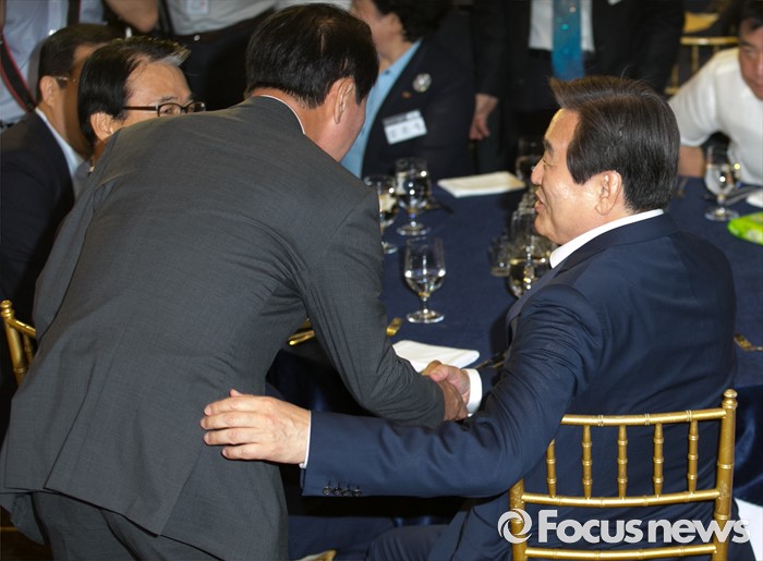 (서울=포커스뉴스) 14일 오후 서울 영등포구 그랜드컨벤션센터에서 열린 당대표 취임 2주년 행사에 참석한 김무성(오른쪽) 새누리당 전 대표가 전당대회 출마를 선언한 한선교 의원과 인사하고 있다.