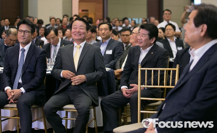 (서울=포커스뉴스) 14일 오후 서울 영등포구 그랜드컨벤션센터에서 열린 당대표 취임 2주년 행사에 참석한 김무성 새누리당 전 대표와 전당대회 출마 의원들이 자리하고 있다. 왼쪽부터 정병국, 한선교, 강석호 의원, 김 전 대표.