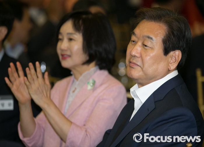 (서울=포커스뉴스) 14일 오후 서울 영등포구 그랜드컨벤션센터에서 열린 당대표 취임 2주년 행사에 참석한 김무성(오른쪽) 새누리당 전 대표와 부인 최양옥 씨가 자리하고 있다.
