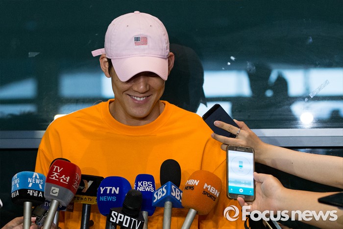 (인천공항=포커스뉴스) 리우 올림픽 출전이 확정된 '마린보이' 박태환이 호주 전지훈련을 마치고 14일 오후 인천국제공항을 통해 입국해 기자회견을 하고 있다.