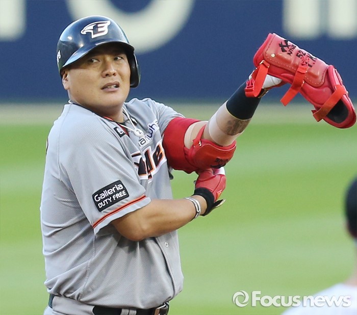 (서울=포커스뉴스) 14일 서울 잠실구장에서 열린 2016 프로야구 한화-LG 경기 1회초 1사 1,3루에서 한화 김태균이 주자를 모두 불러 들이는 우중간 2루타를 치고 베이스 위에서 프로텍터를 풀고 있다.