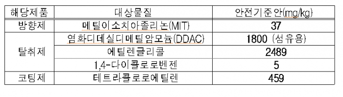 올해 5월까지 추진된 연구는 시중에 유통되고 있는 방향제 20개, 탈취제 26개, 코팅제 12개 제품을 대상으로 제품 사용 과정에서 인체에 미칠 수 있는 위해성을 평가했다. 그 결과 MIT, DDAC, 에틸렌글리콜, 1,4-다이클로로벤젠, 테트라클로로에틸렌 등 5개 물질은 안전기준 설정이 필요하다는 판단을 내리게 됐다.