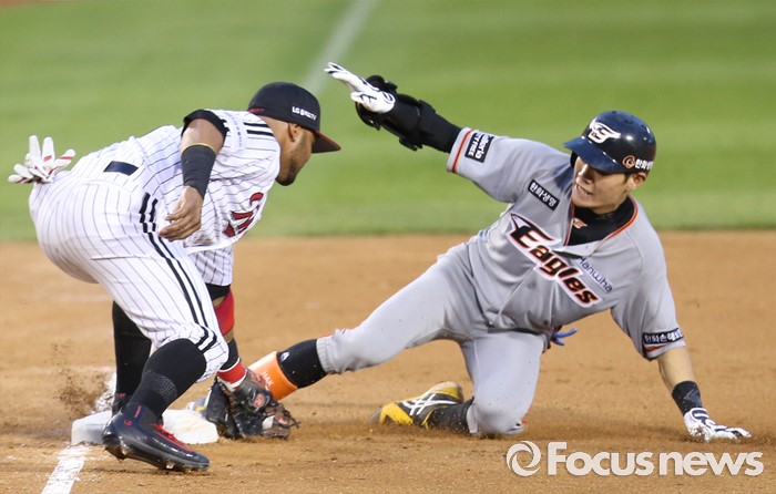 (서울=포커스뉴스) 14일 서울 잠실구장에서 열린 2016 프로야구 한화-LG 경기 4회초 한화 강경학이 우익선상으로 빠지는 타구를 날리고 3루에서 슬라이딩하며 세이프되고 있다.