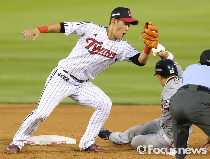 (서울=포커스뉴스) 14일 서울 잠실구장에서 열린 2016 프로야구 한화-LG 경기 4회초 1사 1루에서 한화 송광민이 삼진 아웃되는 사이에 1루주자 이용규가 2루 도루를 시도해 세이프되고 있다.