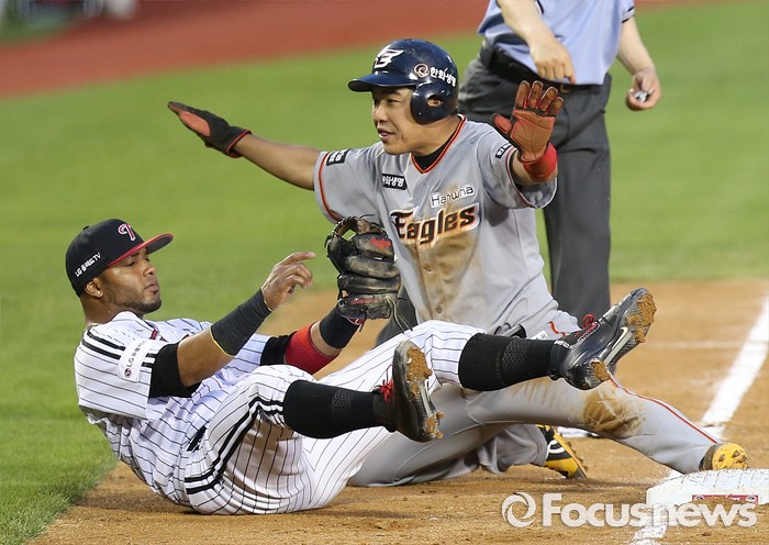 (서울=포커스뉴스) 14일 서울 잠실구장에서 열린 2016 프로야구 한화-LG 경기 4회초 무사 2루에서 한화 2루주자 정근우가 3루 도루를 시도하다 아웃되자 합의판정을 요청해달라고 사인을 보내고 있다. 합의판정 결과는 아웃.