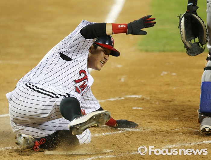| △ 홈슬라이딩하는 LG 유강남 |