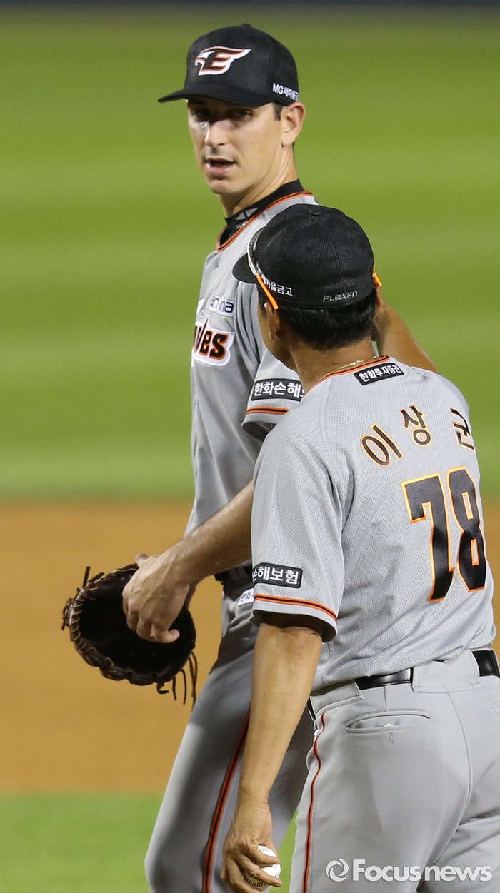 (서울=포커스뉴스) 14일 서울 잠실구장에서 열린 2016 프로야구 한화-LG 경기에서 한화 투수 서캠프가 5회말에 연속 3안타를 맞고 1실점하자 이상군 코츠가 마운드에 올라가 투수 교체를 하고 있다.