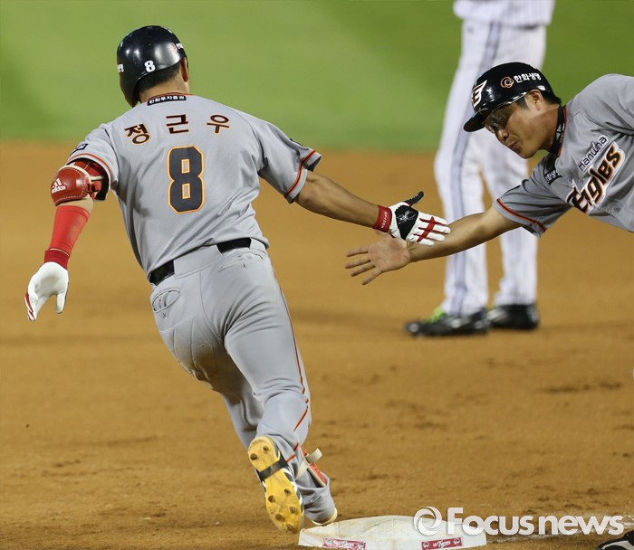 (서울=포커스뉴스) 14일 서울 잠실구장에서 열린 2016 프로야구 한화-LG 경기 6회말 2사후 한화 정근우가 좌월 솔로 홈런을 치고 뛰어 나가며 1루에서 윤재국 코치와 손바닥을 마주치고 있다.
