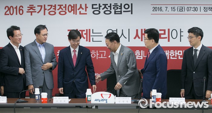 (서울=포커스뉴스) 15일 오전 서울 여의도 국회에서 열린 2016년도 추가경정예산 당정협의에 참석한 의원들과 유일호 경제부총리 겸 기획재정부 장관이 기념촬영을 준비하고 있다. 왼쪽부터 김상훈 새누리당 정책위수석부의장, 이명수 민생특위 위원장, 조경태 국회 기획재정위원장, 유 부총리, 김광림 새누리당 정책위의장, 김세연 미래특위 위원장.