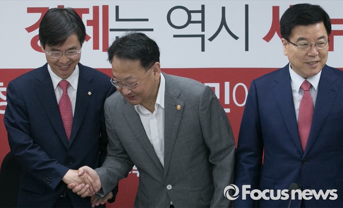 (서울=포커스뉴스) 15일 오전 서울 여의도 국회에서 열린 2016년도 추가경정예산 당정협의에 참석한 의원들과 유일호(가운데) 경제부총리 겸 기획재정부 장관과 조경태(왼쪽) 국회 기획재정위원장이 기념촬영에 앞서 인사하고 있다. 오른쪽은 김광림 새누리당 정책위의장.