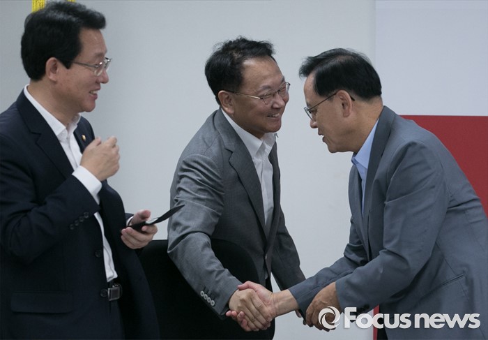 (서울=포커스뉴스) 15일 오전 서울 여의도 국회에서 열린 2016년도 추가경정예산 당정협의에 참석한 유일호(가운데) 경제부총리 겸 기획재정부 장관과 이명수(오른쪽) 새누리당 민생특위위원장이 인사하고 있다. 왼쪽은 김상훈 새누리당 정책위수석부의장.