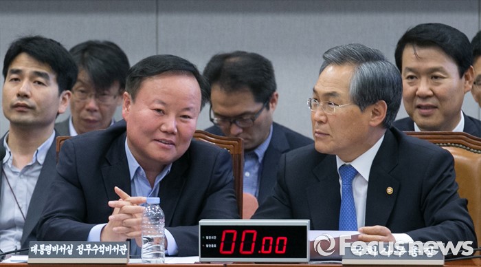 (서울=포커스뉴스) 15일 오전 서울 여의도 국회에서 예정된 운영위원회 전체회의에 참석한 김재원(왼쪽) 청와대 정무수석과 우윤근 국회 사무총장이 대화하고 있다. 이날 새누리당은 더불어민주당 소속 홍영표 국회 환경노동위원장이 야당 단독으로 예비비 지출안 등을 처리한 것과 관련해 홍 위원장의 사퇴를 요구하며 모든 상임위 보이콧을 선언했다.