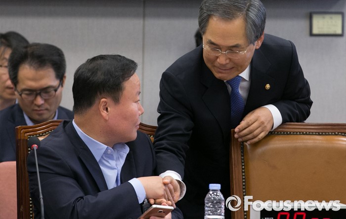(서울=포커스뉴스) 15일 오전 서울 여의도 국회에서 예정된 운영위원회 전체회의에 참석한 김재원(왼쪽) 청와대 정무수석과 우윤근 국회 사무총장이 인사하고 있다. 이날 새누리당은 더불어민주당 소속 홍영표 국회 환경노동위원장이 야당 단독으로 예비비 지출안 등을 처리한 것과 관련해 홍 위원장의 사퇴를 요구하며 모든 상임위 보이콧을 선언했다.