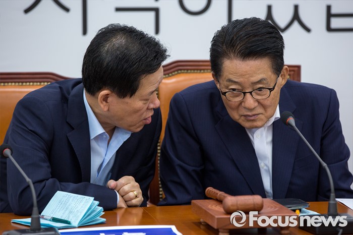 (서울=포커스뉴스) 박지원(오른쪽) 국민의당 비상대책위원장과 주승용 의원이 15일 오전 서울 여의도 국회에서 열린 '비대위원-중진의원 연석회의'에 참석해 대화 하고 있다.