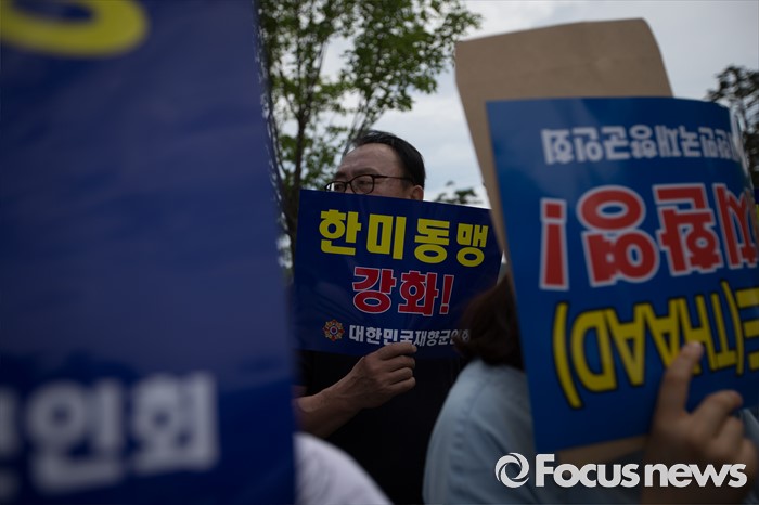 (서울=포커스뉴스) 15일 오전 서울 용산 국방부 앞에서 재향군인회 회원들 및 관계자들이 사드 배치 환영 기자회견을 하고 있다.