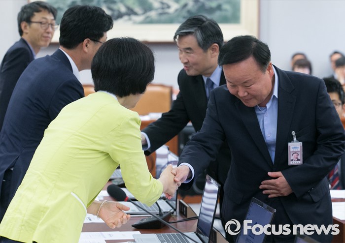 (서울=포커스뉴스) 15일 오전 서울 여의도 국회에서 예정된 운영위원회 전체회의에 참석한 김재원(오른쪽 첫번째) 청와대 정무수석과 조태용(오른쪽 두번째) 국가안보실 1차장이 야당 의원들과 인사하고 있다. 이날 새누리당은 더불어민주당 소속 홍영표 국회 환경노동위원장이 야당 단독으로 예비비 지출안 등을 처리한 것과 관련해 홍 위원장의 사퇴를 요구하며 모든 상임위 보이콧을 선언했다.