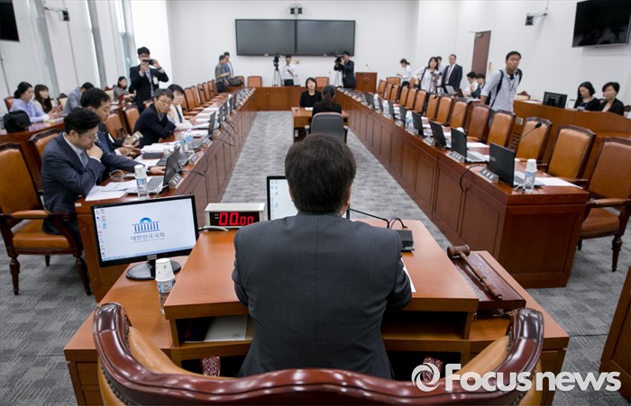 (서울=포커스뉴스) 15일 오전 서울 여의도 국회에서 예정된 가습기살균제 사고 진상규명과 피해구제 및 재발방지 대책 마련을 위한 국정조사특별위원회 전체회의에 참석한 야당 의원들이 새누리당 의원들을 기다리며 회의 진행을 하고 있다. 이날 새누리당은 더불어민주당 소속 홍영표 국회 환경노동위원장이 야당 단독으로 예비비 지출안 등을 처리한 것과 관련해 홍 위원장의 사퇴를 요구하며 모든 상임위 보이콧을 선언했다.
