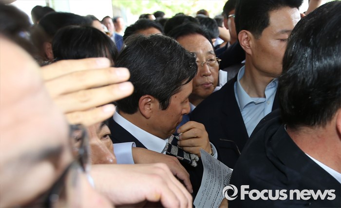 (성주=포커스뉴스) 황교안 국무총리가 15일 오전 경북 성주군청광장에서 사드(THAAD, 고고도미사일방어체계) 배치에 대한 주민설명회에서 주민이 던진 물병에 맞고 손수건으로 얼굴을 닦고 있다.